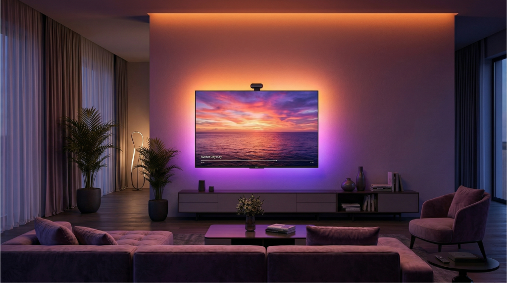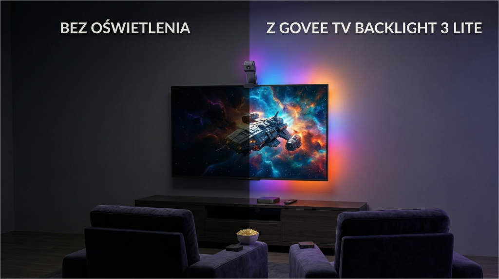 Dla osób, które szukają wrażeń wykraczających poza statyczną poświatę, idealnym rozwiązaniem będzie inteligentne podświetlenie telewizora. Systemy te potrafią „wyjść” z kolorem poza ramy obudowy, tworząc niesamowitą atmosferę w całym pomieszczeniu. Przykładem zaawansowanej technologii jest Govee H605C Envisual TV Backlight T2 Taśma LED. Wykorzystuje ona innowacyjną kamerę z podwójnym obiektywem do analizy kolorów, dzięki czemu każda dioda na pasku wie, jaką barwę wyświetlać w danej milisekundzie, idealnie synchronizując się z akcją.
