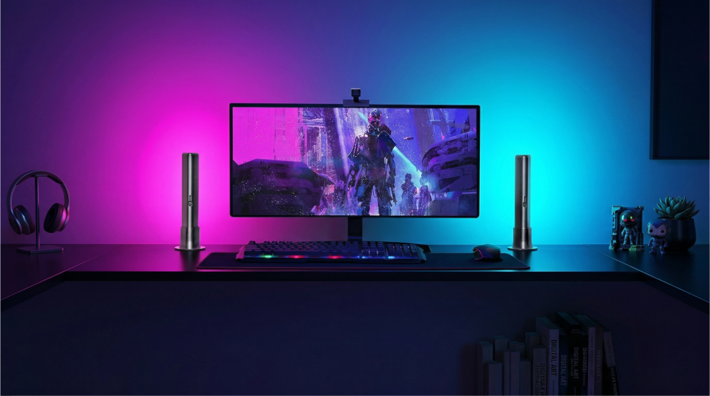 Dla tych, którzy nie chcą przyklejać niczego bezpośrednio do obudowy, idealną alternatywą są Govee H6054 Flow Pro TV Lampy LED. Można je postawić na szafce obok ekranu lub zamontować z tyłu za pomocą uchwytów. To rozwiązanie daje ogromną swobodę w kreowaniu nastroju i pozwala na oświetlenie nad telewizorem w formie eleganckich słupów światła.